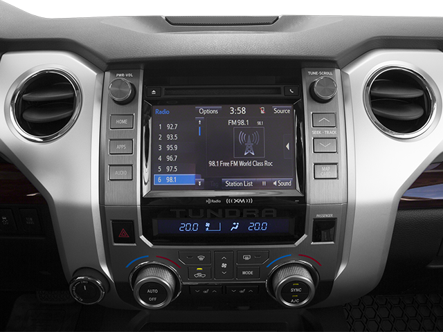 Bluetooth® technology is built into this Toyota Tundra, keeping your hands on the steering wheel and your focus on the road. See what's behind you with the back up camera on this unit. The leather seats in this model are a must for buyers looking for comfort, durability, and style. The installed navigation system will keep you on the right path. The vehicle keeps you comfortable with Auto Climate. Maintaining a stable interior temperature in the Toyota Tundra is easy with the climate control system. This vehicle has an elegant black exterior finish. When you encounter slick or muddy roads, you can engage the four wheel drive on the vehicle and drive with confidence. This 1/2 ton pickup has a V8, 5.7L high output engine. The Toyota Tundra features cruise control for long trips. This 1/2 ton pickup has fog lights for all weather conditions. The vehicle can run on either gasoline or E85 fuel.